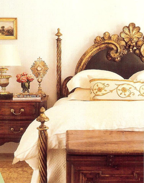 The display of a starburst type monstrance above a bed as a decorative feature is an alternative to a sunburst mirror. Either, an interesting choice for a decorative focal piece.