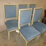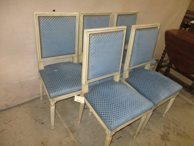 Stock Number: 2256154 Origin: France Circa: 1900's Height: 36.5" Width: 18" Depth: 17" Description: Set of five Louis XVI dining chairs. Seat is 18.5" high