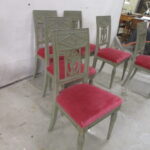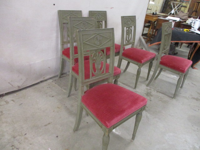 Stock Number: 2257041 Origin: France Circa: 1900's Height: 34.5" Width: 14.5" Depth: 17" Description: Set of six Louis XVI dining chairs. Seat is 17.5" high